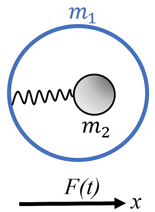 Механическая модель, вызывающая эффект отрицательной эффективной массы, изображена на рисунке 1. Ядро с массой соединено внутри через пружину с постоянной со снарядом массой . На систему действует внешняя синусоидальная сила. . Если решить уравнения движения масс и и заменить всю систему одной эффективной массой получаем[29][30][31][32]: