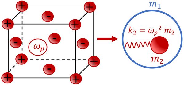Отрицательная эффективная масса (плотность) также становится возможной на основе электромеханической связи, использующей плазменные колебания свободного электронного газа (см. Рисунок 2)[33][34]. Отрицательная масса возникает в результате колебания металлической частицы с частотой , что близко к частоте плазменных колебаний электронного газа относительно ионной решётки . Колебания плазмы представлены упругой пружиной , где — плазменная частота. Таким образом, металлическая частица, колеблющаяся с внешней частотой ω, описывается эффективной массой