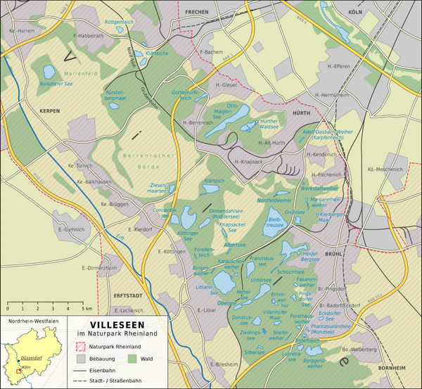Водоём располагается на юго-запад от города Кёльн, целиком в пределах города Хюрт. Он находится в зелёной зоне рекультивации выработанного буроугольного бассейна. Добыча угля в Хюрте и окрестностях велась с начала нового времени. В настоящее время (с 1977 года)[3] рекреационная зона, свободная для прогулок, располагается между районами Хюрта Берренрат, Глойель, Альстедтен-Бурбах, Альт-Хюрт и индустриальной зоной химического завода Кнапзак. Расположенные вблизи заповедные зоны — например, находящееся вблизи маленькое Хюртское лесное озеро — не предназначены для свободного посещения и огорожены забором с колючей проволокой или густо растущими кустарниками[4].