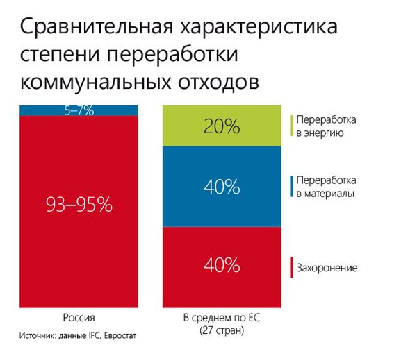 - отсутствием в России экономических условий для переработки основной массы отходов, в результате чего средний уровень переработки отходов не превышает 25 %, а негативное воздействие постоянно накапливаемых отходов на окружающую среду и, следовательно, уровень экологической опасности постоянно возрастают;