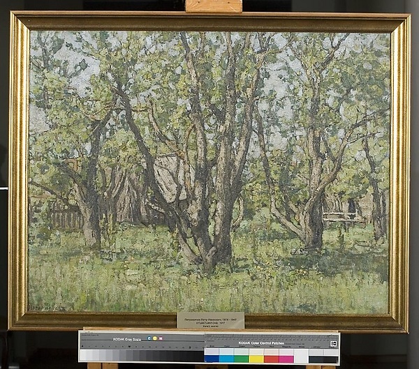 Этюд представляет собой пейзаж, в центре которого изображён уголок сада с густыми деревьями, покрытыми зелёной листвой. Слева сквозь стволы видны деревянный забор и крыша, справа расположены деревянные строения, что подчёркивает элементы деревянной архитектуры. На переднем плане изображена зелёная трава с небольшими жёлтыми цветами. Сквозь кроны деревьев просматривается серовато-голубоватое небо, что формирует сбалансированную композицию и подчёркивает естественную цветовую гамму произведения.