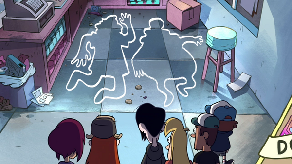 Потом Робби находит место, где раньше лежали обведённые мелом трупы. Диппер ложится на обведённый мелом силуэт и начинаются странности. Подростки хотят покинуть магазин, но его двери закрываются. Диппер успокаивает всех и предлагает найти причину происходящего. Появляется призрак и вселяется в Мэйбл.