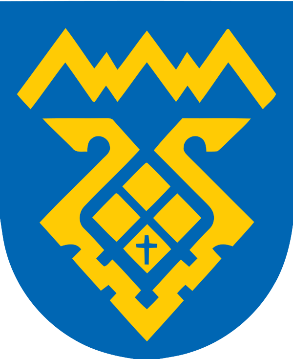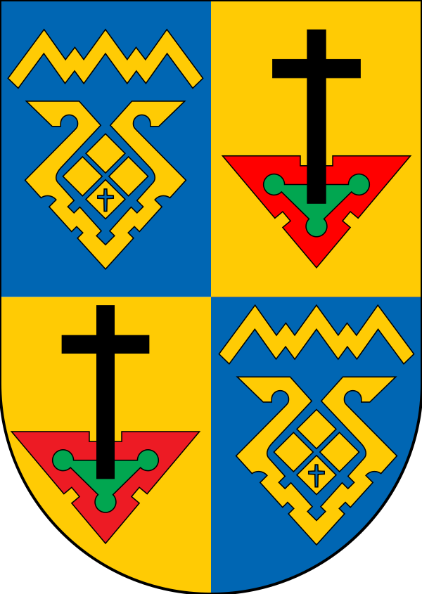 Щит разделён начетверо: в первой и четвёртой частях в лазоревом (синем, голубом) поле опрокинутое стенозубчато-изломанное стропило, соединённое на концах с противонаправленными носами ладей, сопровождённое внутри ромбом, расторгнутым накрест и обременённым в нижней четверти чёрным повышенно-отвлечённым крестом; во главе щита — зубчато-изломанный пояс о трёх больших и двух малых зубцах; все фигуры золотые; во второй и третьей частях в золотом поле пониженное червлёное (красное) укрепление в виде зелёного, окаймлённого червленью, опрокинутого треугольника с выступами (бастионами) на углах и поверх него чёрный повышенно-отвлечённый крест, нижний конец которого поставлен посредине укрепления.