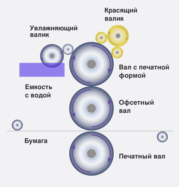 Для нанесения на печатную пластину изображения, необходимы стадии экспонирования и проявки, в процессе которых засвеченные части формы (соответствующие пробельным элементам) становятся гидрофильными и начинают смачиваться водой (увлажняющим раствором), но отталкивают любую маслянистую субстанцию, в частности краску. Оставшиеся (незасвеченные) части форм начинают, наоборот, отталкивать воду и притягивать краску. Они, в свою очередь, называются гидрофобными или олеофильными. Таким образом краска переносится исключительно на гидрофобные части формы, формируя буквы и изображения. При каждом повороте с помощью системы увлажняющих валиков, цилиндр с печатной формой увлажняется, а затем через систему красочных валиков на его гидрофобные части наносится краска. Изображение переносится с цилиндра печатной формой на резинотканевое полотно офсетного цилиндра, а оттуда — на запечатываемый материал. Наличие офсетного цилиндра способствует повышенной тиражестойкости и снижению дефектов печати.