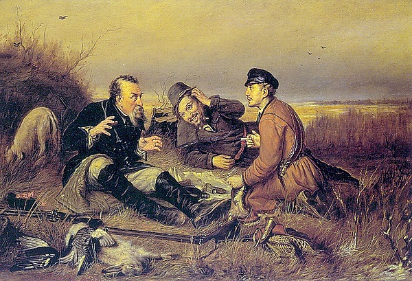 Картина давно уже всем известна: „Охотники на привале“; один горячо и зазнамо врет, другой слушает и из всех сил верит, а третий ничему не верит, прилег тут же и смеется… Что за прелесть! <…> Мы ведь почти слышим и знаем, об чем он говорит, знаем весь оборот его вранья, его слог, его чувства.