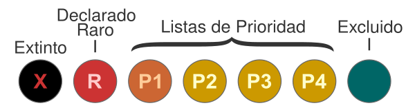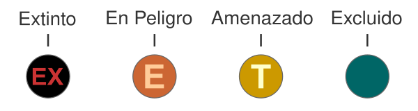 - X: предположительно вымерший, вид не обнаружен при обширных поисках