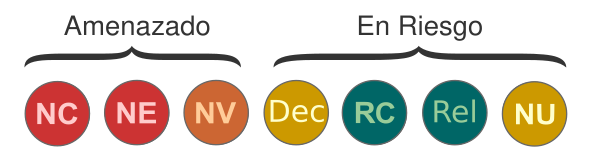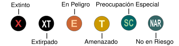 В отчёте виды классифицируются как: особое беспокойство (SC), угрожаемый (T), в опасности (E), истреблённые (XT) и вымершие (X). Также существуют категории Недостаточно данных (DD), когда информации недостаточно, и не под угрозой (NAR), если исследования позволяют заключить, что вид не находится под угрозой[10].