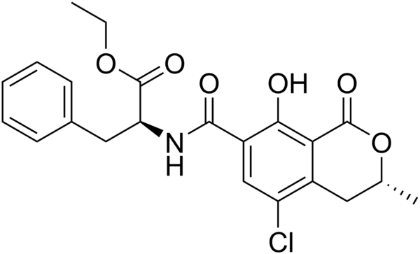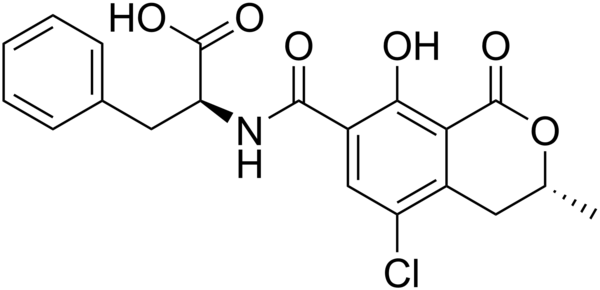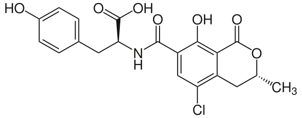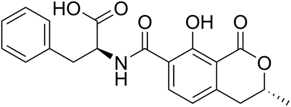 Охратоксины — органические соединения, группа микотоксинов, производные кумарина, продуцируемые некоторыми видами микроскопических плесневых грибов рода Аспергилл и Пеницилл. Основной продуцент охратоксинов среди грибов рода Пеницилл — Penicillium verrucosum, среди аспергиллов — Aspergillus ochraceus и некоторые другие виды аспергиллов, включая A.carbonarius и A.niger. Являются контаминантами. Источниками охратоксинов служат растительные продукты, в особенности зерновые культуры (пшеница, ячмень, кукуруза итд.). Все охратоксины проявляют сильную нефротоксичность. В крови они быстро связываются с белками. Наиболее распространённым и токсичным является охратоксин А. Охратоксины незначительно различаются между собой (имеют сходную структуру молекул). Так, например, охратоксин В в отличие от типа А не содержит атома хлора; охратоксин С — это этилохратоксин А[1].