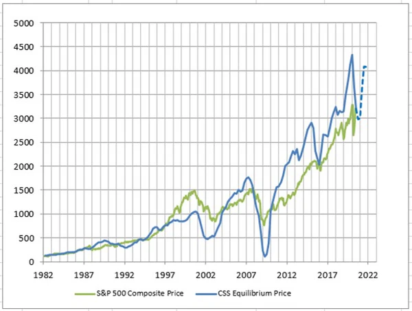 - T — ставка корпоративного налога. Теория CSS предполагает, что цены на акции компании сильно зависят от держателей облигаций. В результате активного выкупа или выпуска акций равновесное ценообразование больше не является результатом балансирования спроса и предложения акционеров. Формула ценообразования активов применима только к компаниям, владеющим долговыми обязательствами. Формула оценки активов также может быть использована на агрегированном рыночном уровне[21]. На полученном графике показано, в какие периоды сводный индекс S&P 500 был переоценён, а в какие — занижен по отношению к равновесию, основанному на теории замещения структуры капитала. Во времена, когда цены на рынке занижены, корпоративные программы обратного выкупа акций позволят компаниям увеличить прибыль на акцию и создать дополнительный спрос на фондовом рынке[22].