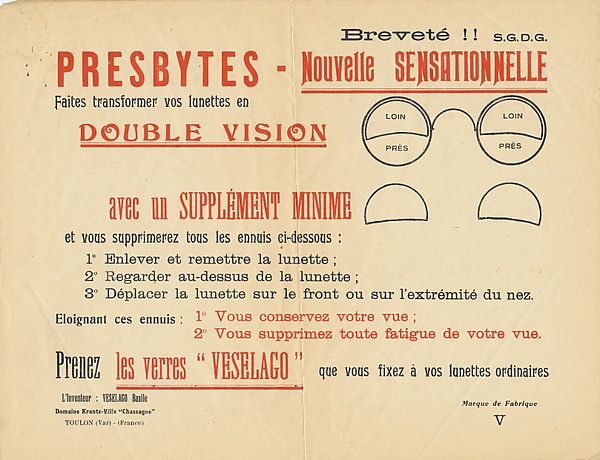 Второе устройство удобнее для глаз. Такие очки называются франклиновскими (бифокальными), а также Verves à double foyer. — Если требуется попеременное частое рассматривание то далеких, то близких предметов, причем рассматривание вдаль не представляет затруднения для глаза, тогда пользуются пантоскопическими очками или двухрамными подъёмными очками[11].