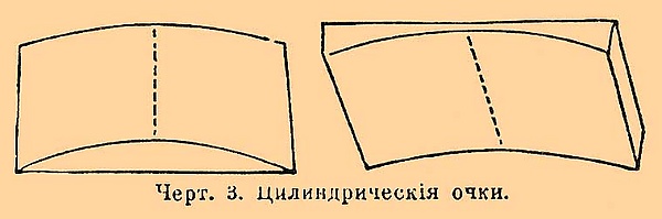 Поэтому цилиндрические очковые стёкла бывают следующих форм: 1) простые цилиндрические стёкла выпуклые и вогнутые с одной плоской и одной цилиндрической или же с 2 цилиндрическими поверхностями с осями параллельными; означаются в практике по своей силе +1/F с (cylindrique); употребляются для исправления астигматизма эмметропного глаза; 2) бицилиндрические с одной выпуклой и одной вогнутой цилиндрическими поверхностями накрест расположенными — обозначаются 1/F1с 1/F2с и сфероцилиндрические означаются