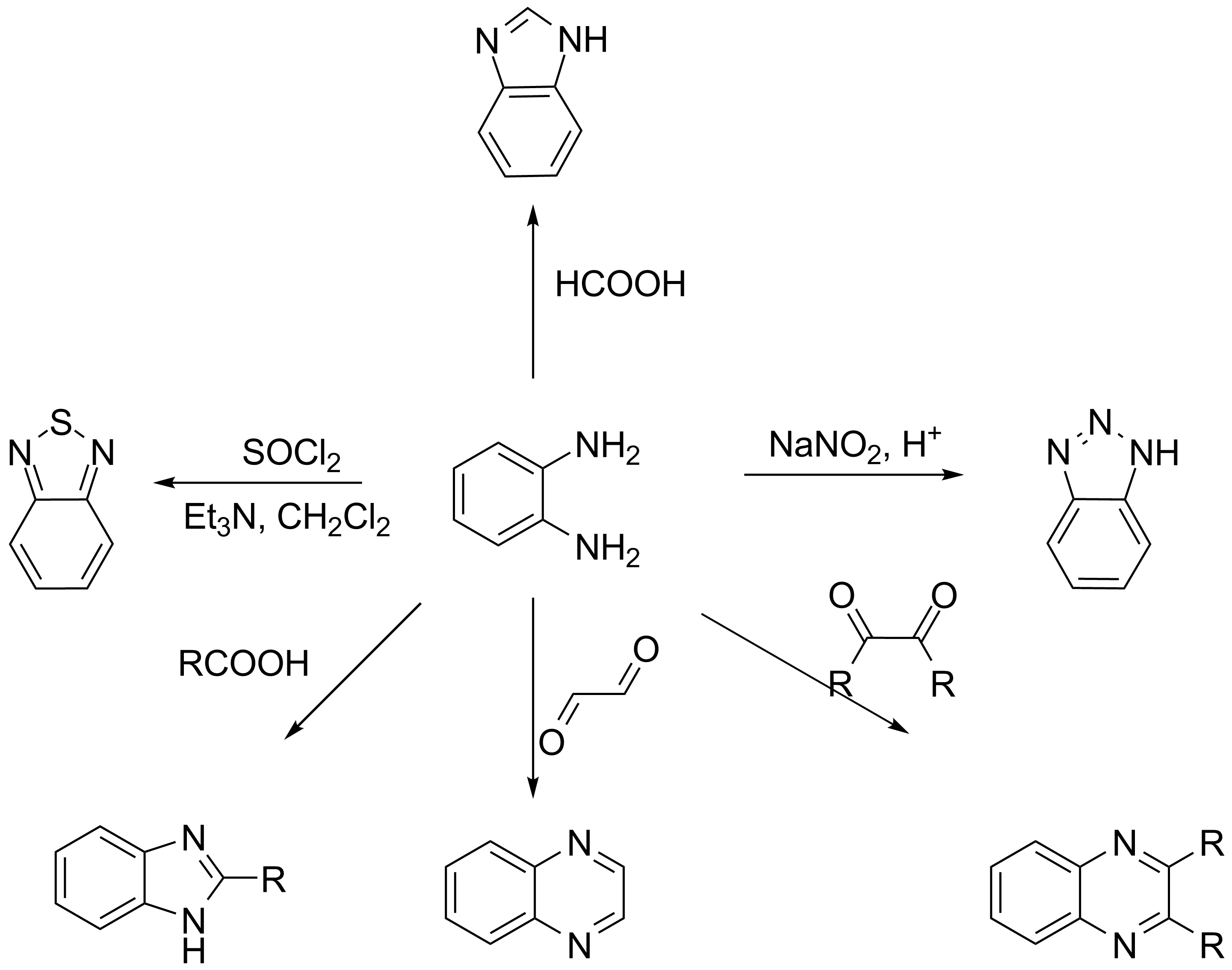 о-Фенилендиамин проявляет свойства типичного ароматического амина, выступая в реакциях как основание и образуя устойчивые соли. Ароматическое кольцо может быть гидрировано с образованием дизамещённого циклогексана. При реакции с муравьиной кислотой происходит циклизация и образуется бензимидазол. Реакция с нитрилами или альдегидами в присутствии ацетата меди(II) приводит в алкилзамещённым бензимидазолам. о-Фенилендиамин можно вводить в реакции с 1,2-дикарбонильными соединениями: при этом получаются хиноксалины. При реакции с азотистой кислотой в разбавленной серной кислоте происходит образование бензотриазола[3].