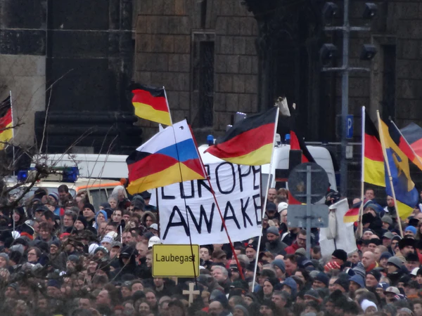 Движение ПЕГИДА было основано в Дрездене Лутцем Бахманом[9] и проводит демонстрации с октября 2014 года с тем, чтобы повлиять на иммиграционную политику правительства ФРГ. Привлекла внимание общественности, когда её митинги начали становиться массовыми и охватывать большое количество людей. Демонстрация 7 декабря собрала около 10 000 человек, а 15 декабря — 15 000 человек[10][11]. Во время еженедельных демонстраций 2015—2017 годов лозунги на транспарантах включали в себя такие, как «За сохранение нашей культуры», «Против религиозного фанатизма» и «Против религиозных войн на немецкой земле»[12]. Число сторонников ПЕГИДА постоянно увеличивалось вплоть до 2016 года; движению удалось выйти за пределы Саксонии и приобрести, в целом, общегерманский характер.