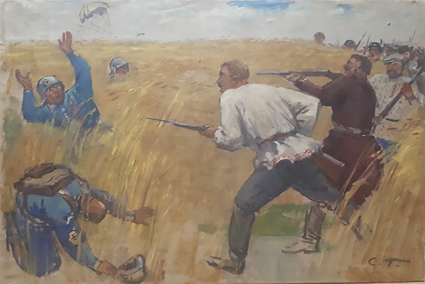 На полотне изображено ржаное поле, на котором разворачивается сцена, характерная для батального жанра. Справа находится группа колхозников, вооружённых винтовками, что подчёркивает участие народа в вооружённой борьбе. Слева представлены три представителя фашистов: один стоит на коленях перед колхозниками, второй с поднятыми руками, третий прячется во ржи. Композиция построена на контрасте между группами, что усиливает драматизм сцены.