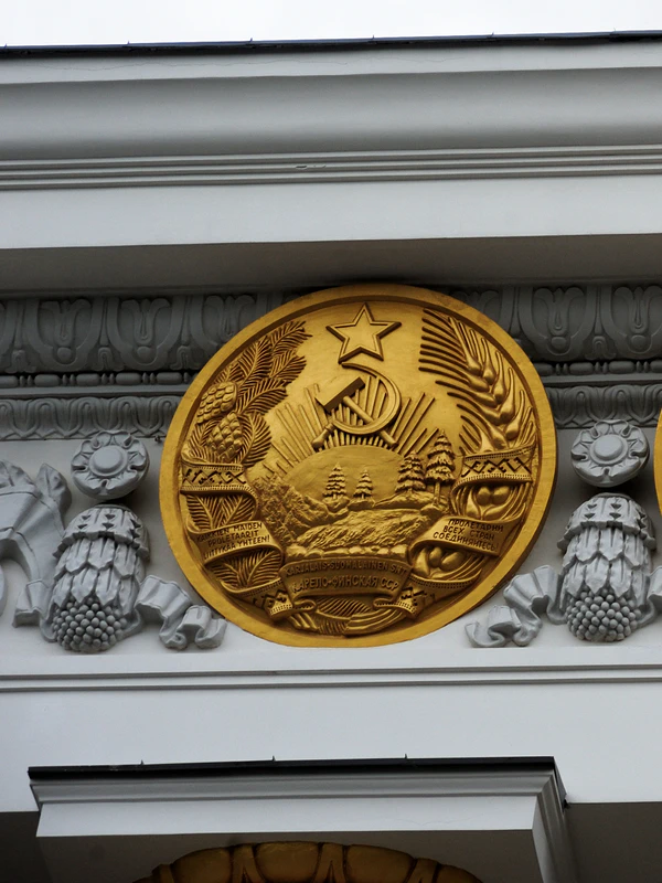 Как и на прежнем павильоне, на нём были установлены герб СССР и по 16 медальонов с двух сторон с гербами союзных республик, существовавших на 1954 год. Позднее, при понижении статуса Карело-Финской ССР и включении её в РСФСР как Карельской АССР соответствующие два медальона с гербами были убраны в 1956 году. В 2018 году при реставрации павильона они были восстановлены в соответствии с первоначальным проектом 1954 года.