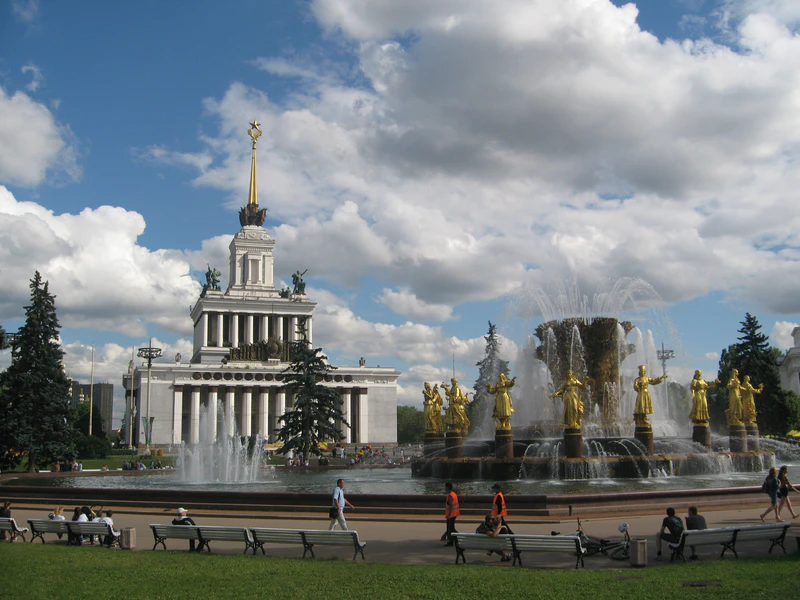 От Главного входа к Главному павильону ведёт аллея 14 фонтанов. Павильон выдержан в традициях русской классической архитектуры и имеет сходство с центральной башней здания Главного Адмиралтейства в Санкт-Петербурге[5]. Авторами использовался архитектурный принцип работы над Дворцом Советов — пропорции, рассчитанные на восприятие с дальних точек, лаконизм деталей, а также ступенчатость композиции. Уступами, напоминающими ступени гигантской лестницы, павильон поднимается вверх и увенчан золочёным шпилем со звездой[4].