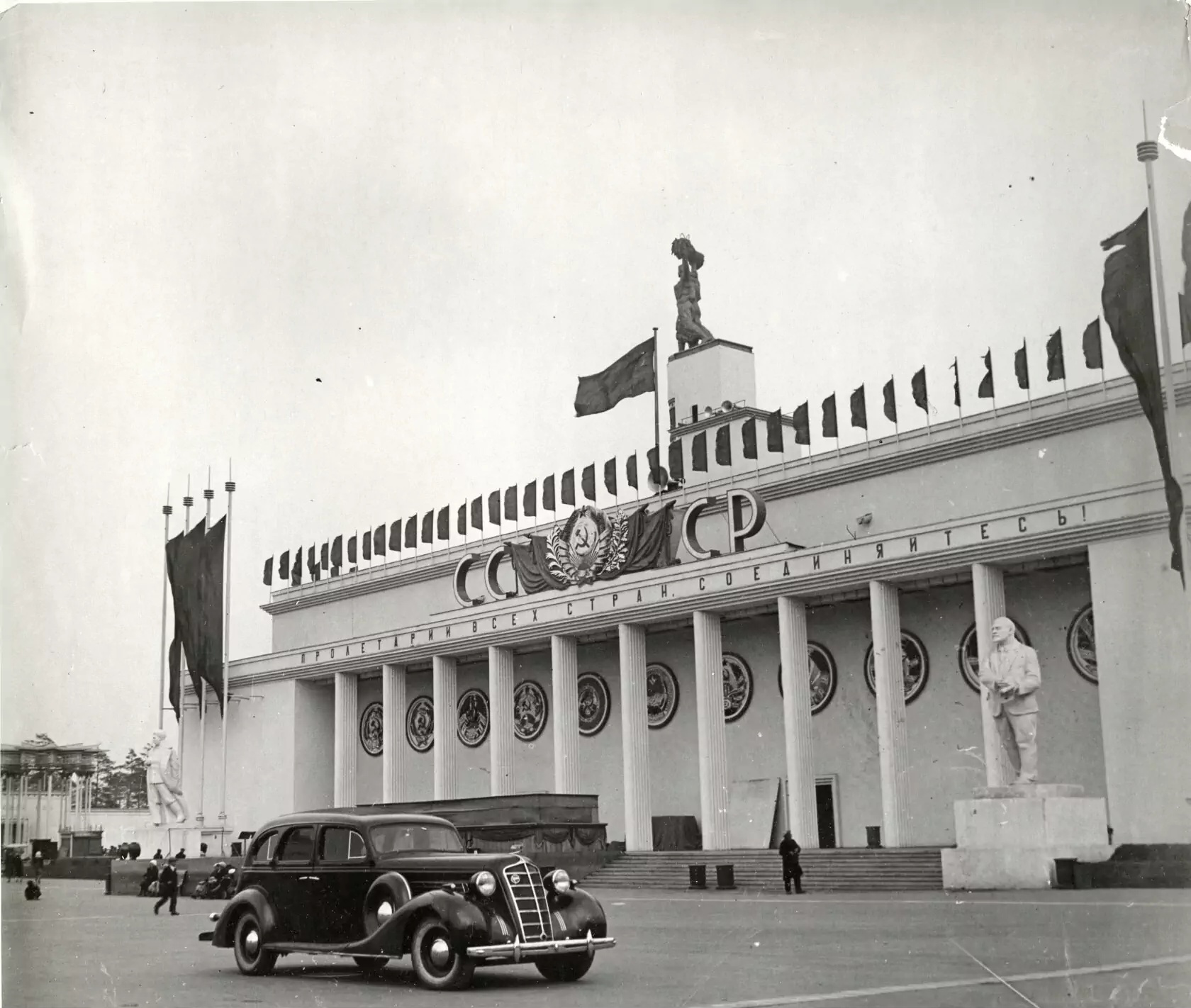 Монументальное здание Главного павильона Всесоюзной сельскохозяйственной выставки было построено в 1939 году по проекту академика Г. В. Щуко и профессора В. Г. Гельфрейха. От главного входа на выставку к деревянному павильону вела широкая аллея. У павильона была сооружена 56-метровая башня, на которой установлена эмблема выставки — 13-метровая золочёная скульптурная группа «Тракторист и колхозница». Павильон украшали одиннадцать золочёных гербов cоюзных республик и огромный герб СССР[2]. Перед ним на площади Колхозов на фоне знамён были установлены скульптурные фигуры вождей — Ленина и Сталина.