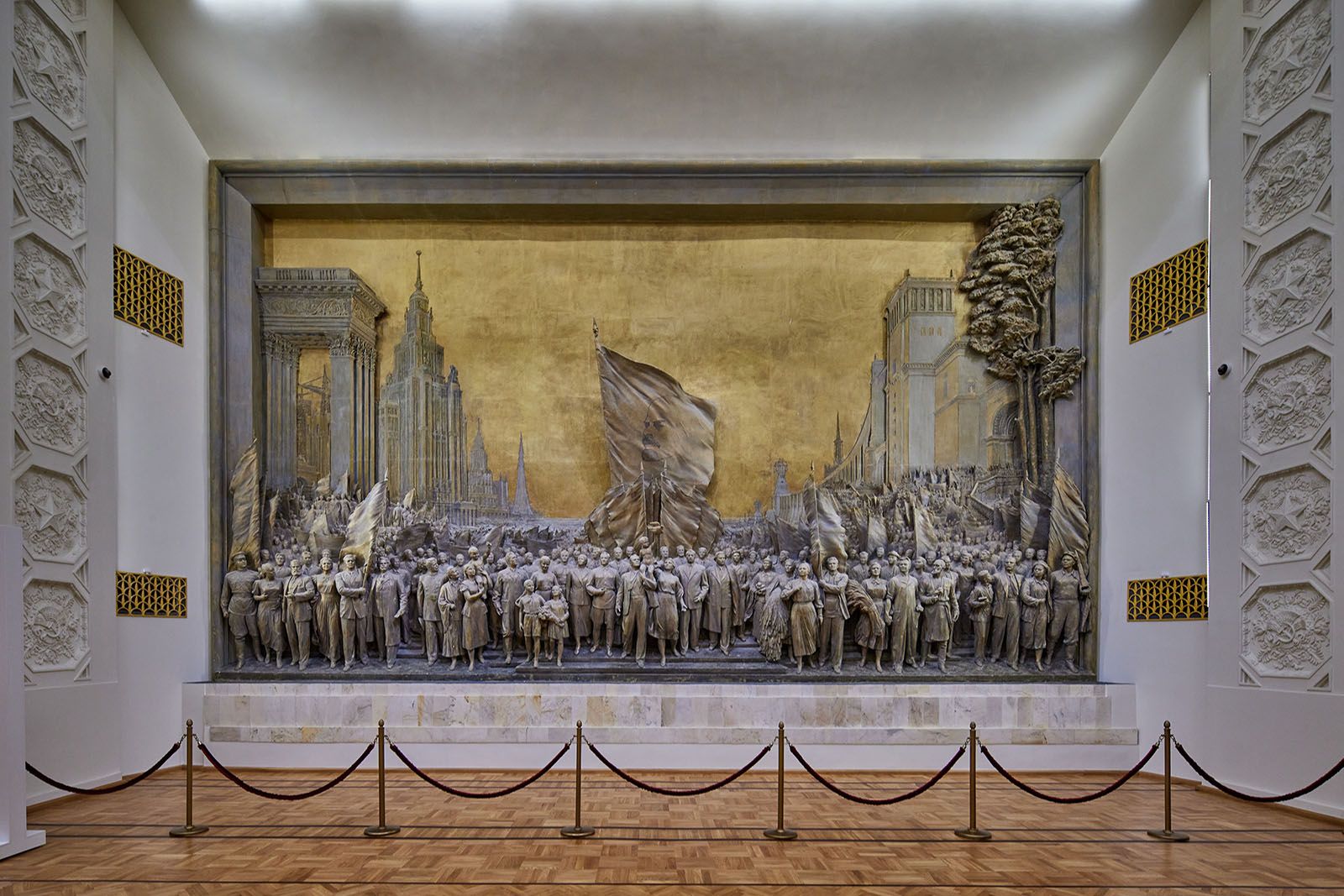 Следующий зал Победы Советского Союза в Отечественной войне и борьбы за мир. Центральный объект зала — огромный гипсовый горельеф, тонированный под бронзу, под названием «Знаменосцу мира, советскому народу — слава!». Площадь горельефа составляет 90 квадратных метров. На нём изображено более 1,5 тысяч человек. Автор горельефа — Евгений Вучетич во главе коллектива из восьми скульпторов. В горельеф входят скульптуры в человеческий рост, — рабочие, учёные, молодые матери с детьми, пионеры — в некоторых из которых можно узнать прототипы. Фигуры будто спускаются к зрителям от сталинской высотки, гидроэлектростанции, Шуховской башни. В 1960-е годы горельеф был закрыт фальшстеной, а затем замурован. В настоящее время он расчищен и отреставрирован. Нынешняя версия не содержит примет культа личности Сталина, от которых избавились ещё до закрытия горельефа[8][11].