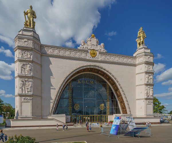 С 1967 года экспозиция «Машиностроение» стала занимать только половину павильона, а в другой половине разместилась экспозиция «Космос», которая знакомила посетителей выставки с историей и новейшими достижениями Советского Союза в области освоения космоса. Демонстрировались стенды на тему развития ракетной техники, модели искусственных спутников Земли, луноходов, системы жизнеобеспечения космонавтов, подлинный спускаемый аппарат космического корабля «Восток». Скульптурная композиция «Шествие советских людей к коммунизму» была демонтирована и заменена портретом Юрия Гагарина. В 1975 году были установлены состыкованные копии космических кораблей «Союз — Аполлон».[3][2]