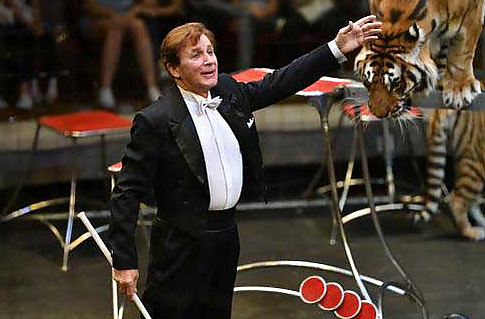 Работает в клетке с тиграми в образе дирижёра без ассистентов.