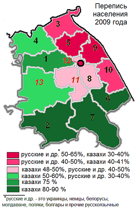казахи — 55,94 % русские — 29,56 % украинцы — 5,53 % немцы — 3,21 % татары — 1,89 % другие — 3,87 % (2021 г.) |
