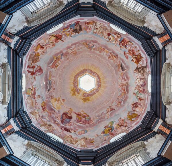 Ансамбль имеет строго осевую композицию, аллея подводит к въездным воротам, за которыми длинный проезд между каменными оградами ведёт до круглой площадки для разворота карет; здесь посетители проходили через вторые ворота, за которыми раскрывается вид на монументальный храм с двухбашенным фасадом и куполом. За храмом — закрытый сад с индивидуальными домиками монахов и башней для отшельников на 33-метровой оси[1]. Находящаяся в центре ансамбля церковь имеет вогнутый двухбашенный фасад, расчленённый пилястрами ионического большого ордера. Храм перекрыт шестигранным куполом внушительных размеров (13 м диаметром и 49 м высоты), увенчанный изящным шестигранным фонарём. Пространственная композиция церкви имеет некоторое сходство с храмом Санта-Мария-делла-Салюте в Венеции[15][16].