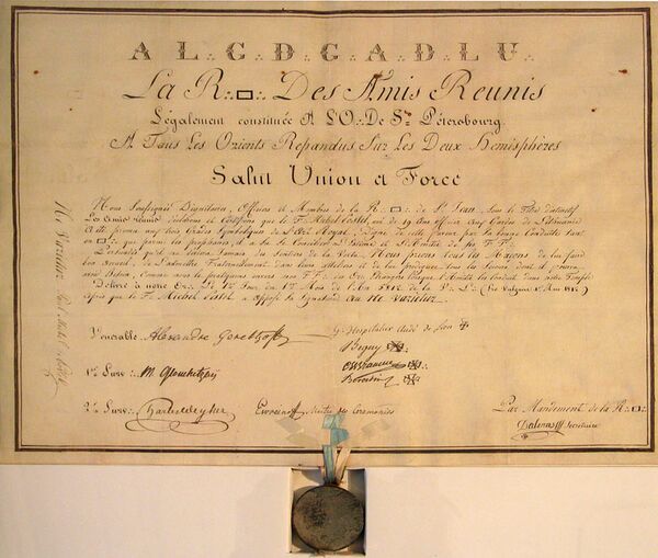 Вопреки правительственному запрету Карл Осипович выполнил своё обещание — Пестель стал масоном первого, ученического градуса ещё в стенах Пажеского корпуса[29], а 1 марта 1812 года, будучи уже прапорщиком лейб-гвардии Литовского полка, получил диплом мастера ложи «Соединённые друзья», наделяющий его правом работать в трёх символических градусах. Карл Осипович подписал его, среди прочих офицеров ложи, в качестве дародателя (фр. Hospitalier)[30]. Освоив с юных лет формы и методы организации вольных каменщиков, Пестель впоследствии внедрял их (с большим или меньшим успехом) в деятельность тайных политических союзов[29].