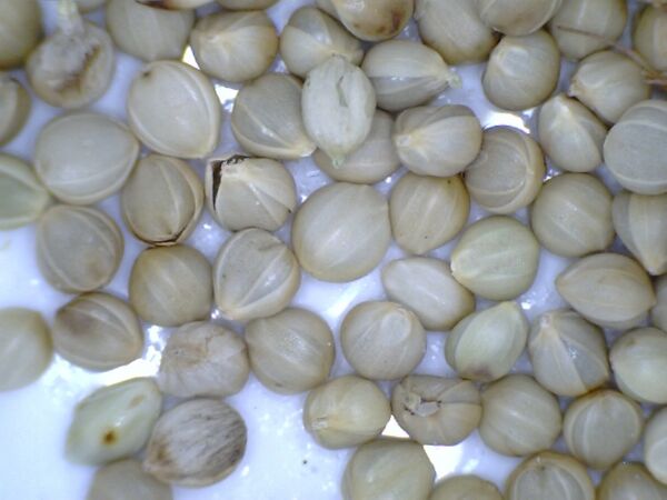 Зерновка овальная или широкоэллиптическая, 1,7—3,5 мм длиной, заключена в блестящее зеленовато- или пепельно-серые цветковые чешуи. Вес 1000 семян 2—3,5 г.