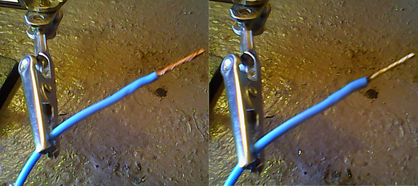 - Лужение. На зачищенное место пайки наносится тонкий слой флюса. Затем место пайки приводится в соприкосновение с расплавленным припоем (например, касанием облуженного горячего паяльника или погружением в расплавленный припой). Если все сделано правильно, то деталь в месте контакта с припоем смачивается им. После охлаждения слой застывшего припоя должен быть блестящим, сплошным и ровным.
