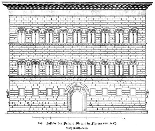 Классические ренессансные палаццо XV века можно увидеть во Флоренции. Такое палаццо представляет собой величественное двух- или трёхэтажное здание сурового вида с мощным карнизом и машикулями. Маленький дворец называют «палацетто» (итал. palazzetto), иногда со сторожевой башней. Стены оформлены рустом, окна первых этажей забраны решёткой: городская жизнь в то время была неспокойной. Парадный, приёмный зал для гостей итальянского палаццо именуют форестерией (итал. foresteria), от (итал. forestiero — чужеродный, приезжий)[2].