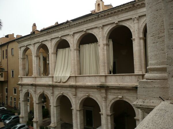 Своды вестибюля с лаквеариями (кессонами) восходят к традициям купола Пантеона и сводов базилики Максенция на Римском форуме. Главная лестница с аркадами и крестовыми распалубками также говорит о работе большого мастера, возможно, Л. Б. Альберти либо Франческо дель Борго. Однако договор на строительство 1466 года, подписанный Папой Павлом II, был заключён с резчиком по мрамору и скульптором Якопо да Пьетрасанта[7]. Большую роль в строительстве здания играли «магистри комачини», или «комаски» (так называли мастеров Северной Италии, с берегов о. Комо, и из тессинского кантона Швейцарии) во главе с Манфредо ди Антонио ди Комо. Рядом с ними работали Мео дель Каприно из Флоренции и Нуччо де Рисис ди Нарни[8].