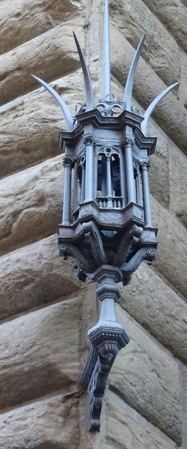 Примечательностью дворца являются вошедшие во все «истории» западноевропейского искусства кованые железные детали фасадов: держатели для факелов, флагов и кольца для привязывания лошадей — шедевры мастера Никколо Гроссо, известного как Капарра (итал. Il сaparra — залог, задаток), из-за того, что он всегда просил за работу деньги вперёд. Особенно интересны размещённые по углам фонари в форме небольшого храма с «шипами», драконы и сфинксы с факелами.
