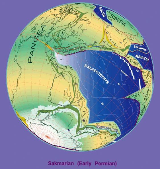В среднем карбоне произошло столкновение Гондваны и Евро-Америки. Западный край нынешнего Северо-Американского материка столкнулся с северо-восточной окраиной Южно-Американского, а северо-западный край Африки — с южным краем нынешней Центральной и Восточной Европы. В результате образовался новый суперконтинент Пангея. В позднем карбоне — ранней перми произошло столкновение Евро-Американского материка с Сибирским, а Сибирского материка с Казахстанским континентом. В конце девона началась грандиозная эпоха Герцинской складчатости с наиболее интенсивным проявлением при формировании горных систем Альп в Европе, сопровождавшихся интенсивной магматической деятельностью. В местах столкновения платформ возникли горные системы (с высотой до 2000—3000 м), некоторые из них просуществовали и до нашего времени, к примеру, Урал или Аппалачи. Вне Пангеи находилась только Китайская глыба. К концу палеозоя, в пермском периоде, Пангея протягивалась от южного полюса до Северного. Южный географический полюс в это время находился в пределах современной Восточной Антарктиды. Входивший в состав Пангеи Сибирский материк, являвшийся её северной окраиной, приближался к Северному географическому полюсу, не доходя до него 10—15° по широте. Северный полюс в течение всего палеозоя находился в океане. В это же время образовался единый океанический бассейн с главной Прото-Тихоокеанской впадиной и единая с ней впадина океана Тетис[8].