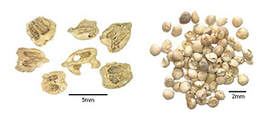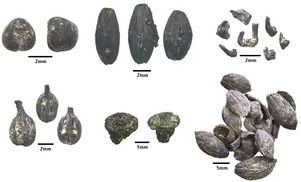 - Первый, «биоминерализация», происходит, когда определённые растительные остатки, такие как плоды Celtis sp. (ежевика) или орехи семейства Boraginaceae, естественным образом вырабатывают повышенное количество карбоната кальция или кремнезёма в процессе своего роста, в результате чего образуются кальцифицированные или силицированные образцы[9][10][11].