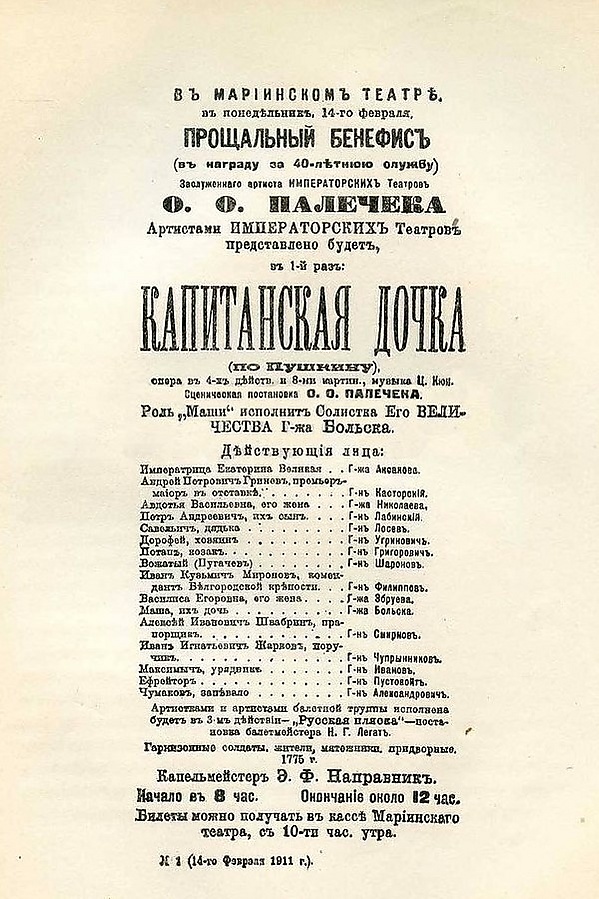 первые постановки опер П. И. Чайковского («Иоланта», 1892), Н. А. Римского-Корсакова («Млада», 1892; «Ночь перед Рождеством», 1895; «Сервилия», 1902), С. И. Танеева («Орестея», 1895), Н. Ф. Соловьёва («Корделия», 2-я редакция, 1898), К.Галкаускаса («Цыганы», 1908), Ц. А. Кюи («Капитанская дочка», 1911)[5];