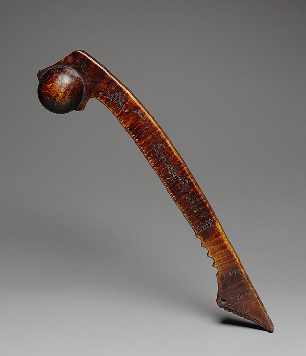 Подобный деревянный инструмент, как правило, состоит из рукояти и ударно-боевой части в виде утолщения или массивного навершия (головки). Рукоять и массивное утолщение составляют единое целое.