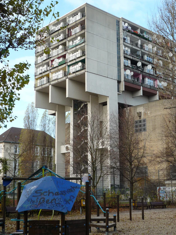 12-этажное здание было построено полностью из бетона в 1977 году по проекту архитектора Юргена Заваде и как образцовый объект современного жилого строительства. Прежде на этом месте находился Берлинский дворец спорта, его снесли 13 ноября 1973 года.