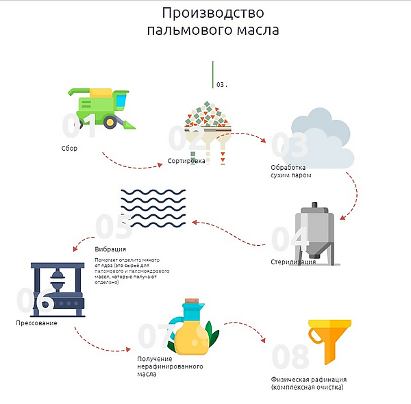 Современная технология производства пальмового масла включает в себя следующие стадии: