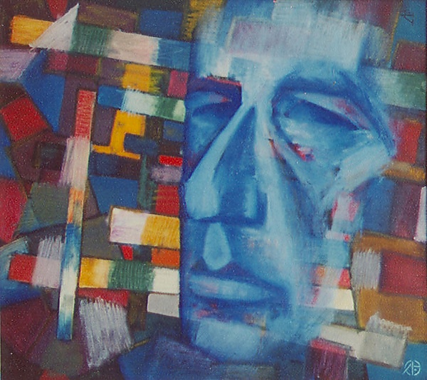 На картине представлен мужской портрет, выполненный в стилизованной манере с использованием элементов абстрактного искусства. На разноцветном фоне, занимающем основную часть полотна, в правой части синим цветом изображено лицо мужчины средних лет в развороте три четверти влево. Образ характеризуется крупным прямым носом и полными губами, однако изображение лица неполное — отдельные участки просвечиваются сквозь фон, что подчёркивает экспериментальность композиции и усиливает взаимодействие фигуры с абстрактным пространством.