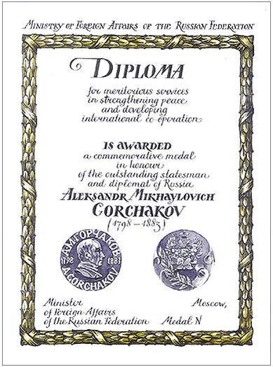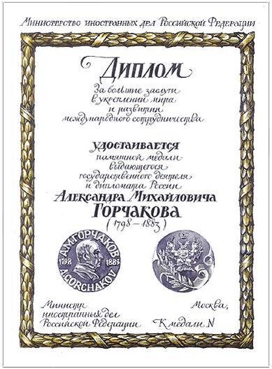 …6. Министерству иностранных дел Российской Федерации, Министерству культуры Российской Федерации и Министерству финансов Российской Федерации обеспечить изготовление образца памятной медали А. М. Горчакова, которая будет вручаться российским и иностранным гражданам за особые заслуги в обеспечении внешнеполитических интересов России, и представить согласованные предложения в установленном порядке.…