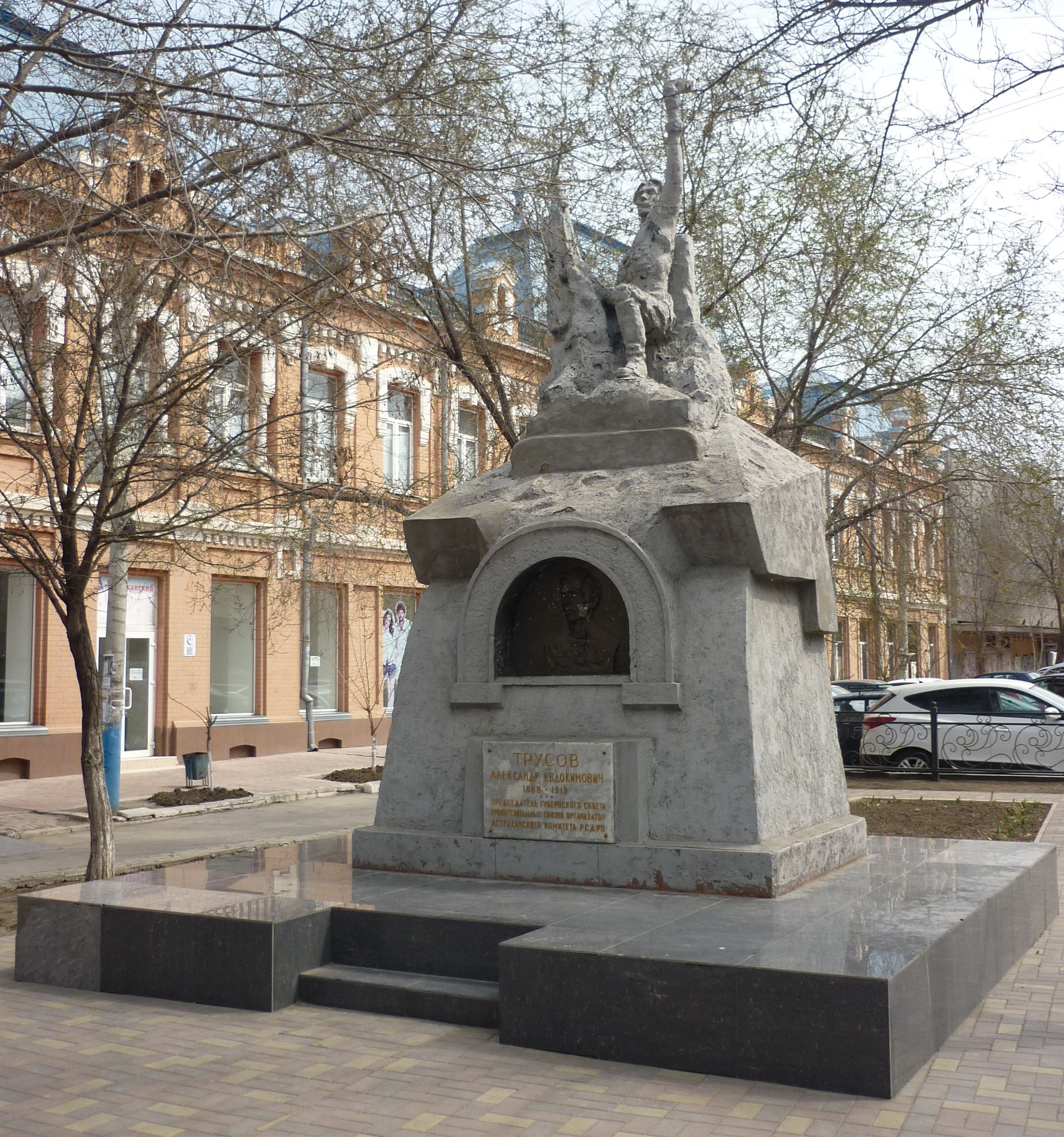 | 1922 | Памятник А.Е. Трусову | скульптор П. Н. Котов | Александр Евдокимович Трусов умер 13 апреля 1919 г., а 28 августа 1922 г. на его могиле был открыт памятник. На трапециевидном постаменте установлена бетонная фигура преклонившего колено рабочего В правой руке он держит знамя, а в левой руке горящий факел, являющийся символом просвещения. Постамент выполнен из кирпича, оштукатурен и окрашен. Общая высота постамента и скульптуры 4 метра. В нише постамента под аркой находится портрет А. И. Трусова. Под нишей прикреплена мемориальная доска. В двадцатые годы ниша была застеклена, а на портрете были металлические очки. | На улице Эспланадной около ЦУМа | Объект культурного наследия регионального значения | |