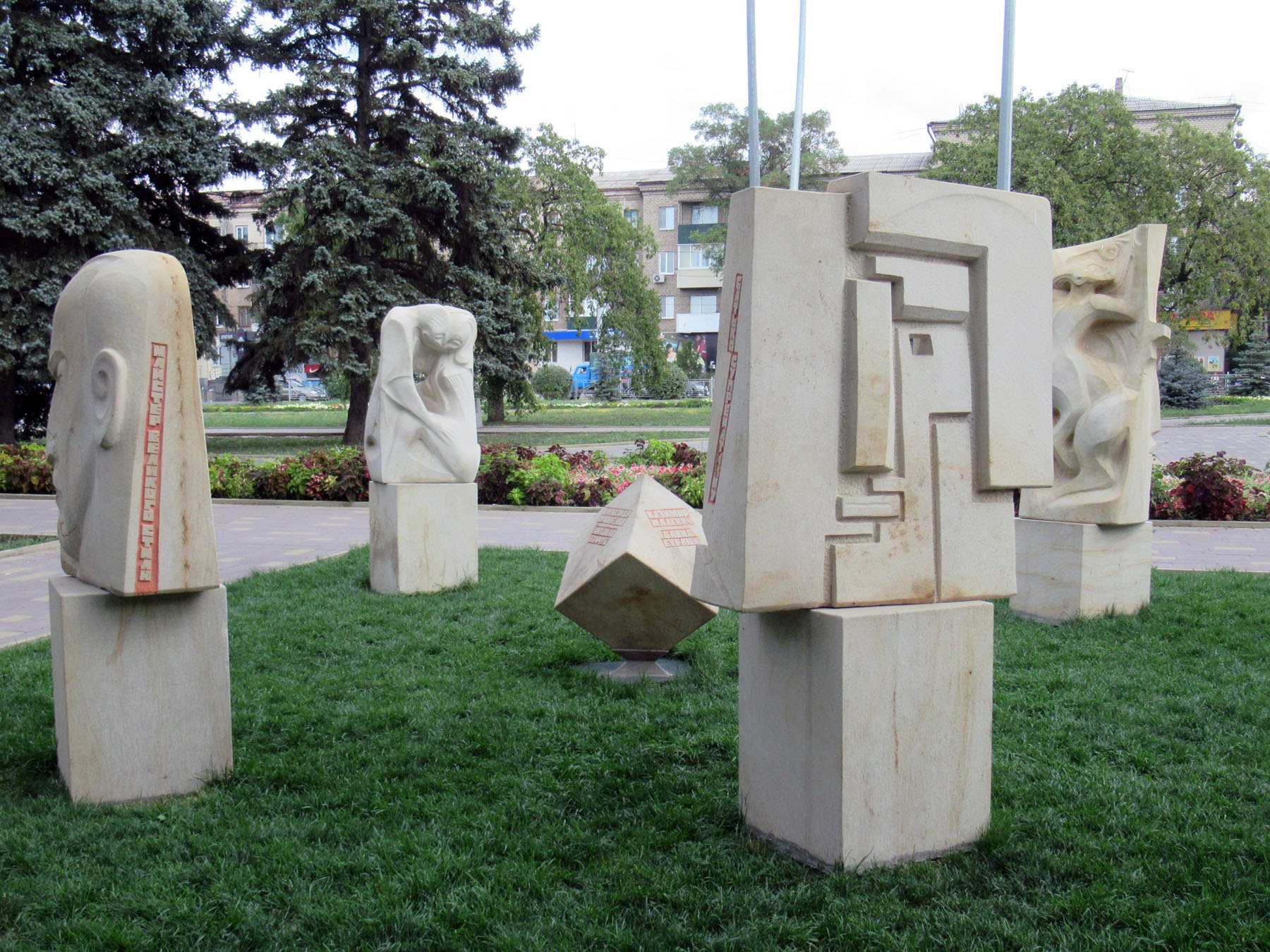 24 августа 2020 — скульптурная композиция «рождённые в Украине»: памятник Казимиру Малевичу, Давиду Бурлюку, Александру Архипенко и Михаилу Бойчуку — сквер «Лабиринт», скульптор В. Гутыря