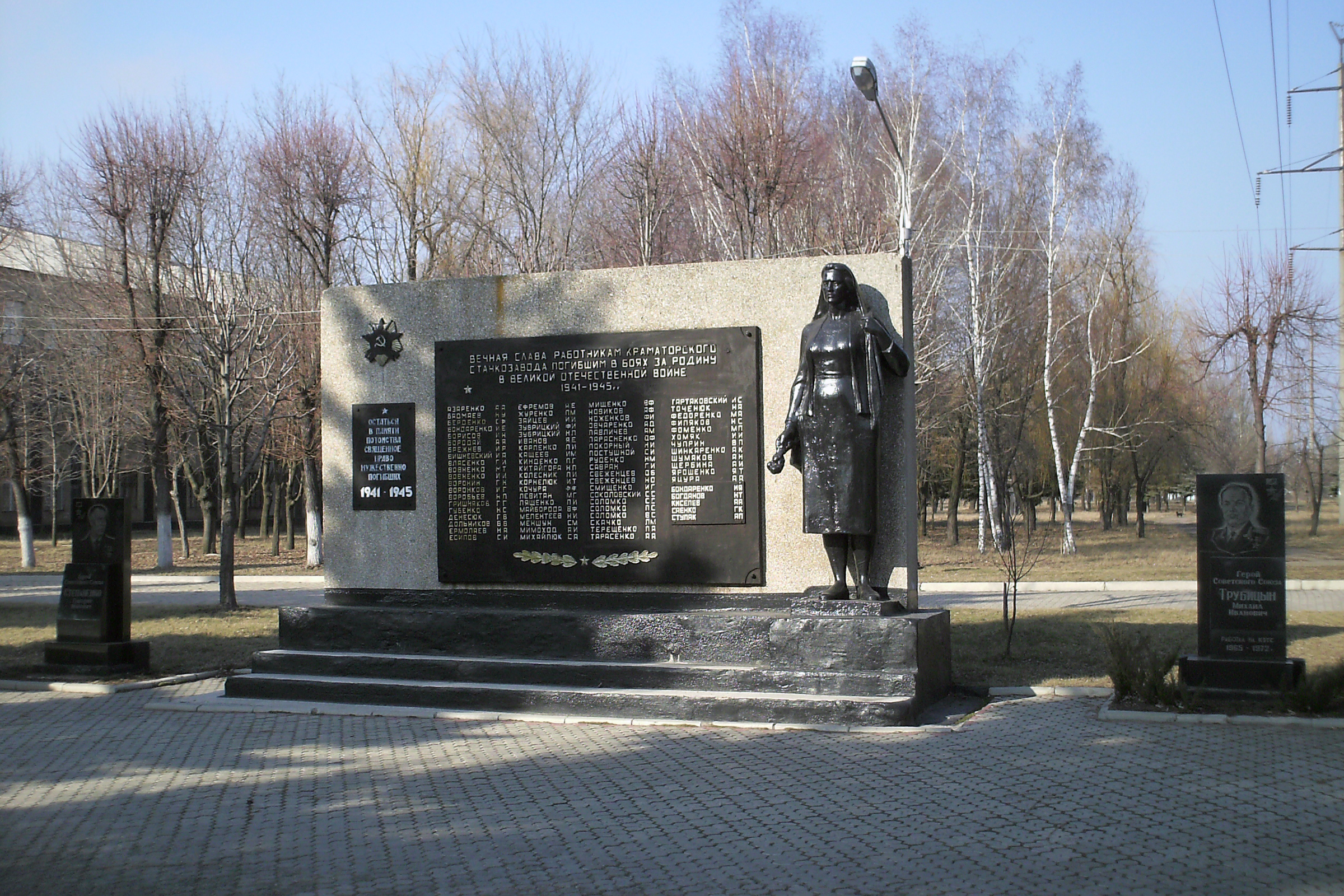 8 мая 1970 — Погибшим новокраматорцам с вечным огнём (зажжён в 1980-х) — НКМЗ, автор В. П. Лобко[1].