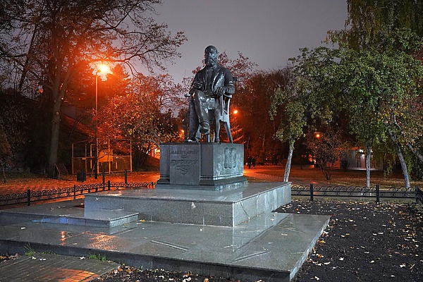 Бронзовая фигура, представляющая единое целое с бронзовым постаментом, «покоится на низком гранитном полированном основании, состоящем из трёх врезанных друг в друга прямоугольных объёмов»[3].