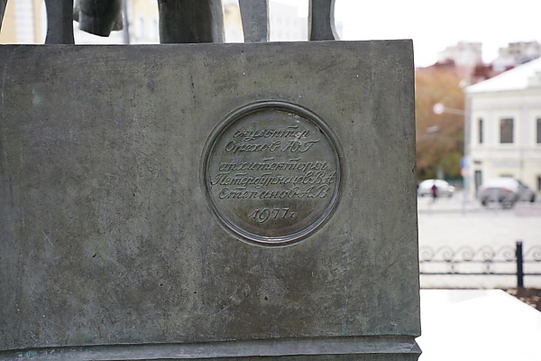 В правой части тыльной стороны постамента размещена круглая розетка, в которой указаны авторы памятника: «скульптор Орехов Ю. Г., архитекторы Петербуржцев В. А., Степанов А. В., 1977 г.» (1977 год — это год отливки памятника в бронзе[3]).