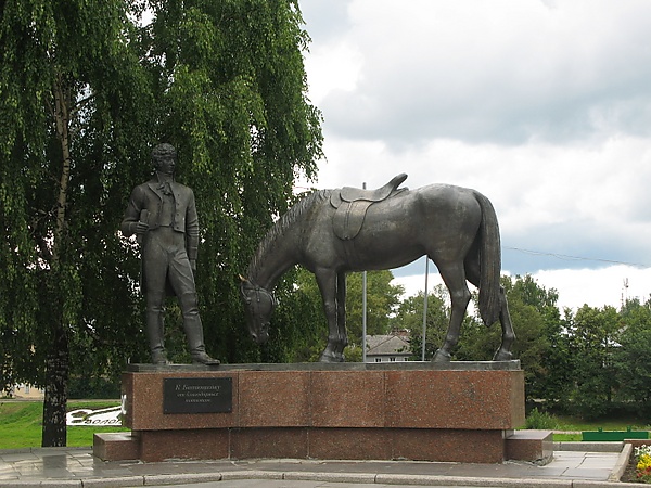 Батюшков стоит перед лошадью, в руках у него бумажный свиток. На нём военный мундир, а на ногах надеты кавалерийские сапоги. Поэт является участником Отечественной войны 1812 года, имел ранение и дважды был удостоен государственными наградами. Ради поэзии он оставил службу, именно потому и понурена голова боевого коня.