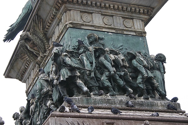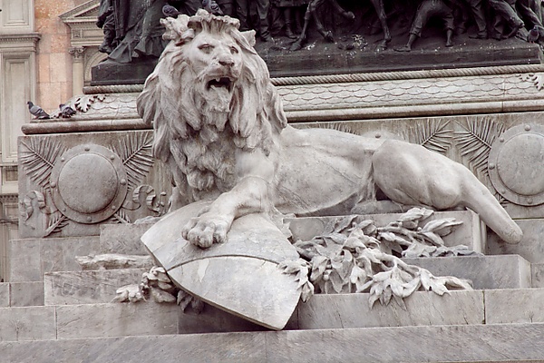 На беломраморной лестнице пьедестала помещены два льва, лежащие на боковых ступенях и лапами попирающие щиты с названиями «Рим» и «Милан» — величайшие завоевания в Рисорджименто (войне за независимость).