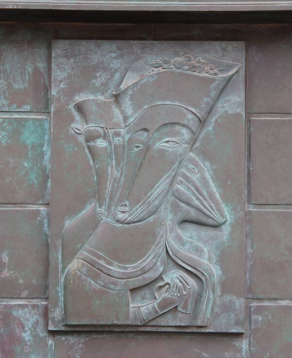 Горельеф Марины Влади смещён относительно центра стены вправо. Повествование о жизни героя ведется слева направо. Марина пришла в жизнь Владимира за 12 лет до его ухода. Она представлена скульптором в роли принцессы Клевской в одноименном фильме Жана Деланнуа (1961 год)[9] Архивная копия от 5 мая 2016 на Wayback Machine, снятому по роману М. М. де Лафайет.[10] Архивная копия от 20 апреля 2016 на Wayback Machine Роль Марина сыграла, когда ей было 23 года.