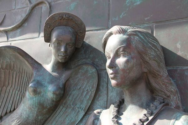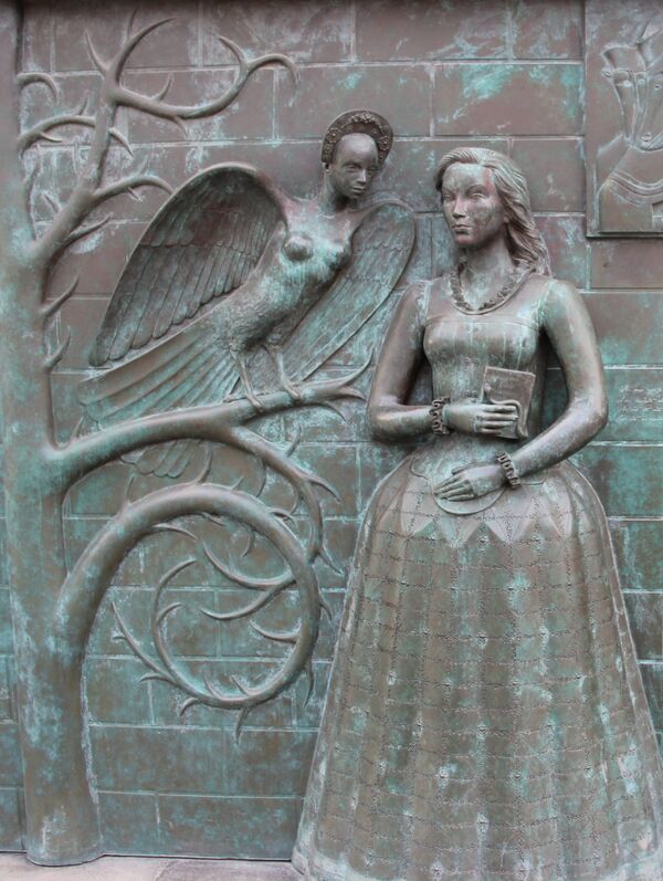На бронзовой стене «разросся» куст терновника, его ветви — как длинные закрученные в полукружья шипы создают красивый орнамент. На кусте сидит мифическая птица Алконост с грудью и головой молодой женщины. На гладко убранных назад волосах — кокошник, но её лицо выглядит современно. Птица приподняла крылья и смотрит на Марину, которая внимает ей и будто углублена в свои мысли. Марина одета в старинное платье, но причёска современная. В руках она держит книгу «Владимир, или Прерванный полет»[7], из-под которой выползает змейка.