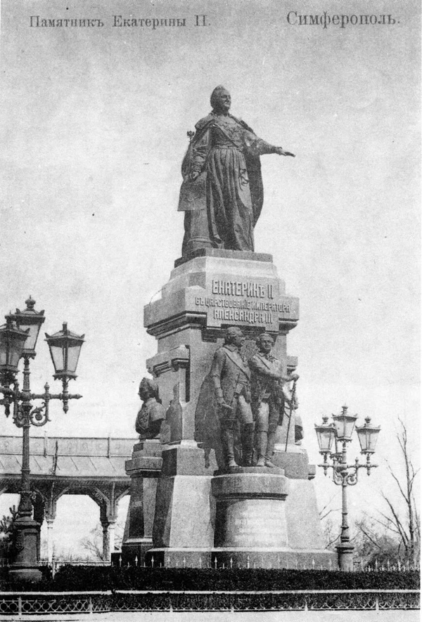 Автором первого памятника императрице Екатерине Великой был академик Императорской Академии Художеств Н. А. Лаверецкий. Возведение памятника было приурочено к столетнему юбилею присоединения Крыма к России. Работы велись на народные пожертвования. Существенную помощью в организации сбора средств, конкурса и строительства оказали Таврический губернатор Андрей Никитич Всеволожский, Таврический губернский предводитель дворянства В. В. Олив, Симферопольский предводитель дворянства Василий Попов. Василий Попов, как и губернатор, пожертвовал на сооружение памятника немало собственных средств. Закладка памятника состоялась 8 апреля 1883 года. Всего на его изготовление было затрачено 92 тысячи рублей. Монумент торжественно открылся 18 октября 1890 года на территории городского сада. Монумент представлял собой бронзовую статую императрицы на гранитном пьедестале. В правой руке Екатерина II держит скипетр и развёрнутую карту Крыма, левая — простёрта к городу. Вокруг подножья памятника располагались скульптуры государственных деятелей екатерининской эпохи, участвовавших в присоединении Крыма к России — князей Григория Потёмкина-Таврического и Василия Долгорукова-Крымского, полководца Александра Суворова, посланника России в Турции Якова Булгакова[1][2].